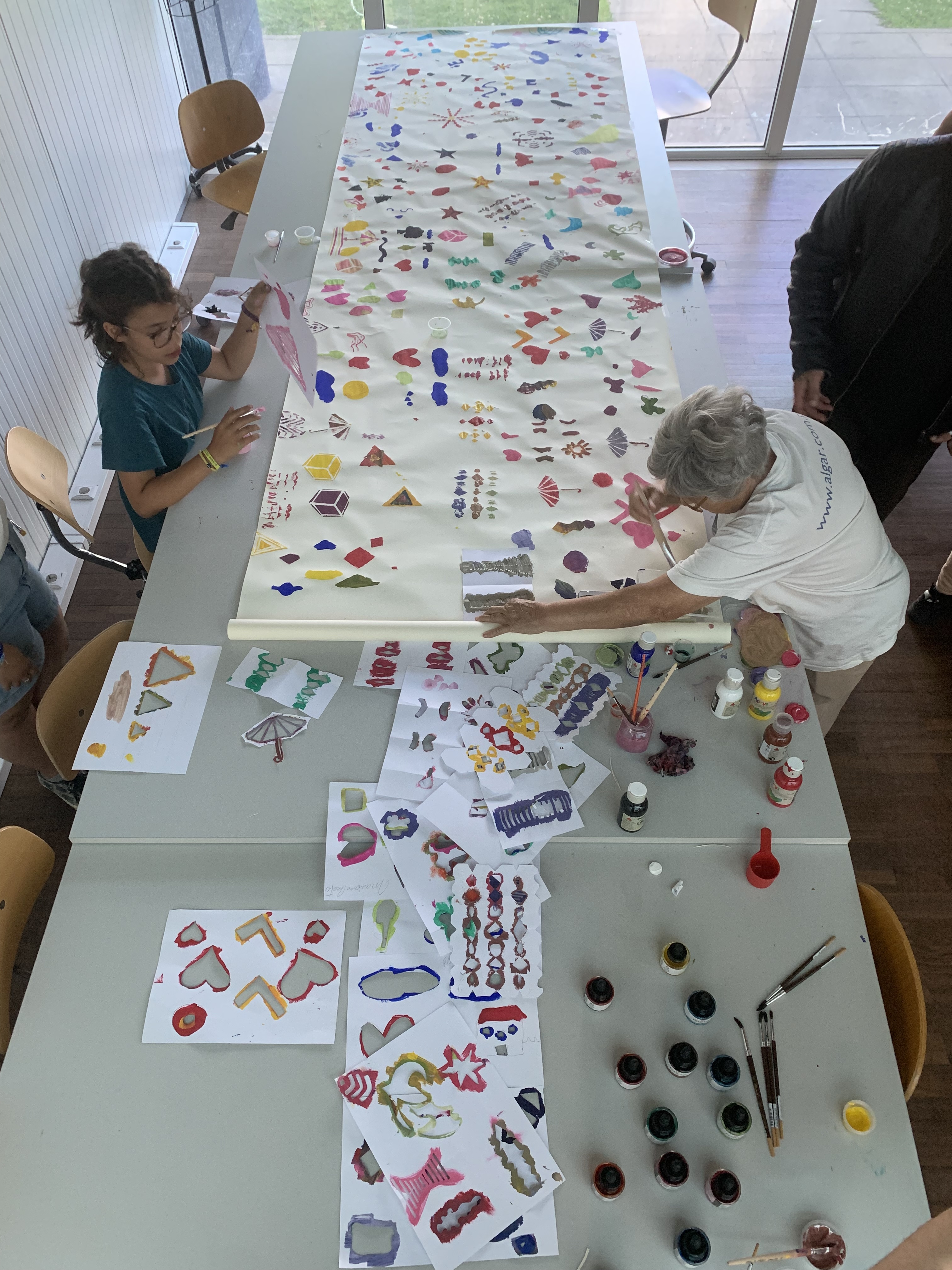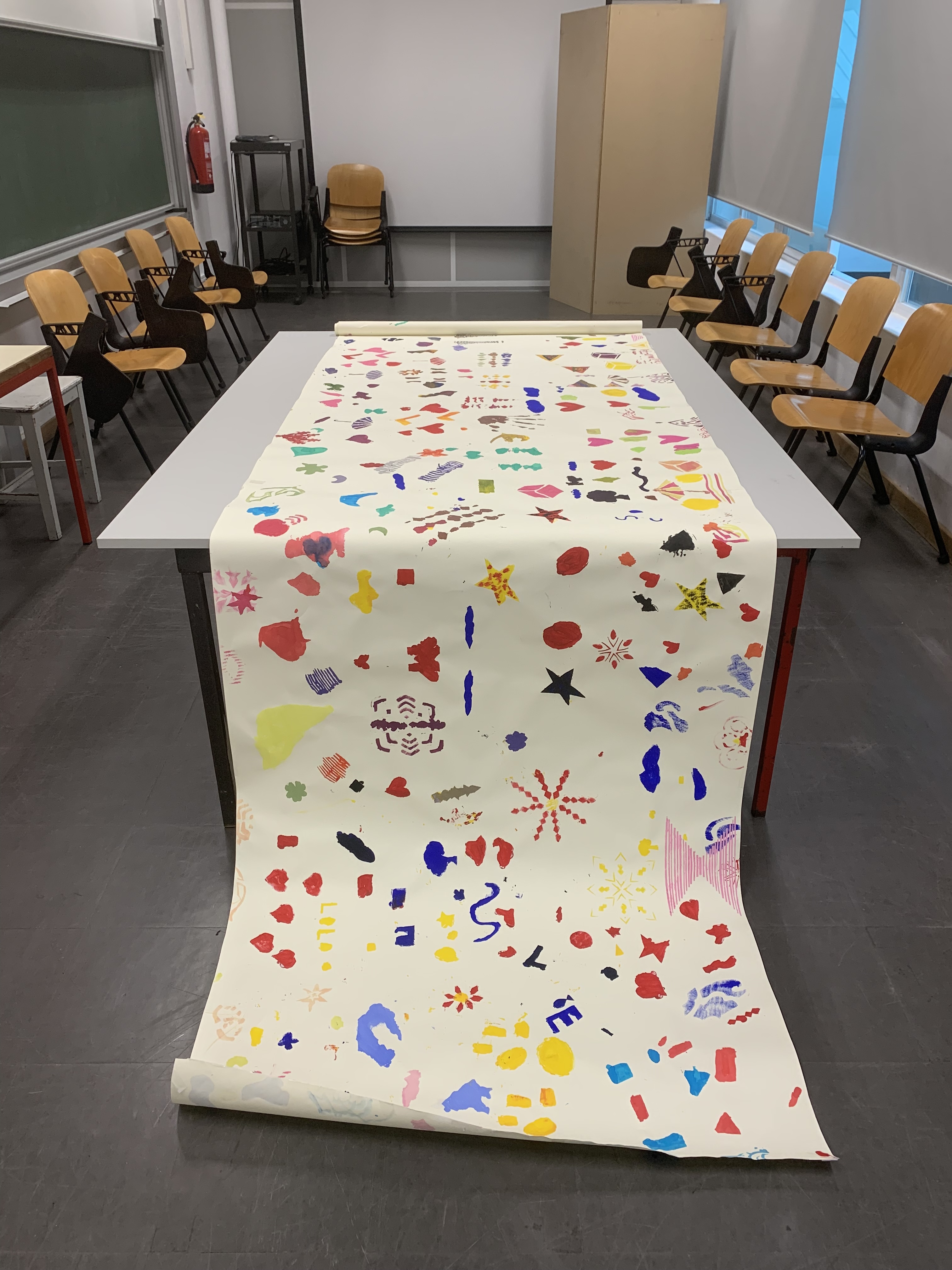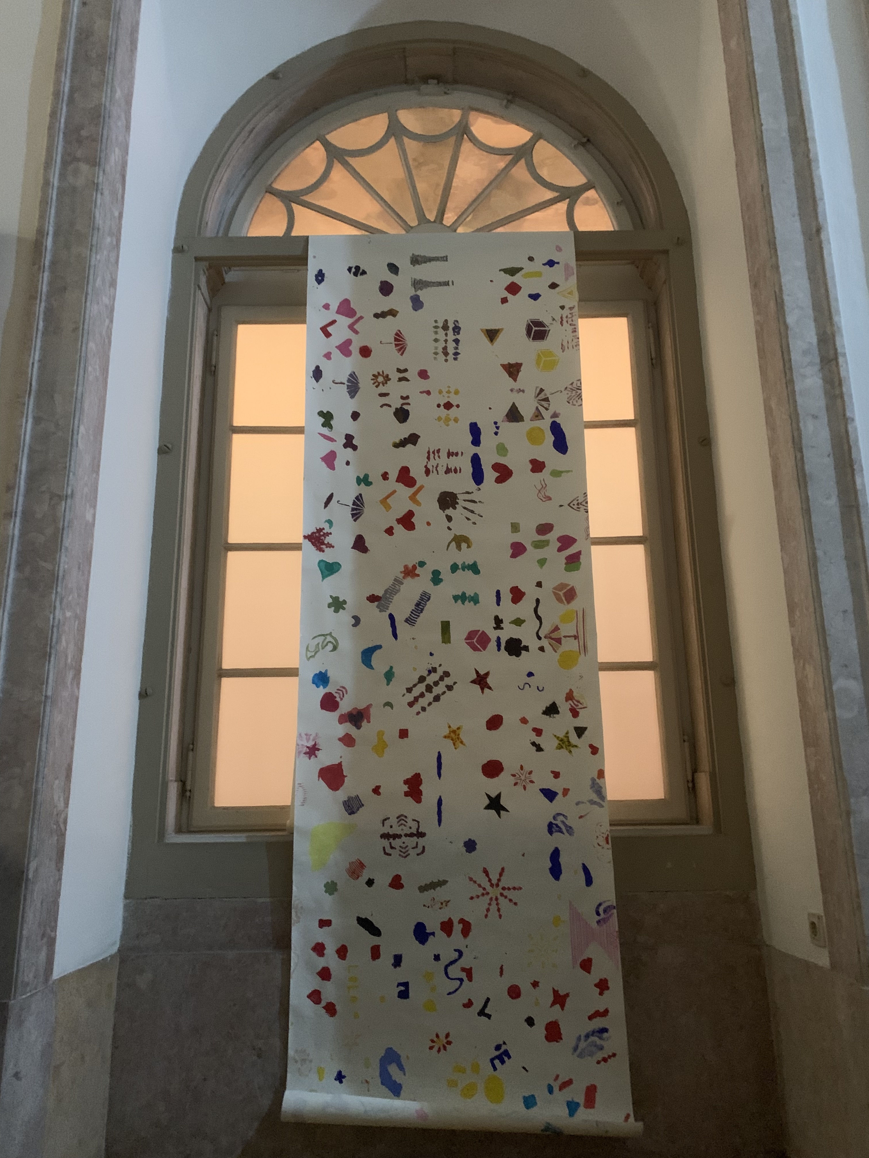 Above, a view of one of the activities that saw more involvement among participants a collective stencilled scroll, shown as exhibited at the Palácio da Ajuda, on the right.